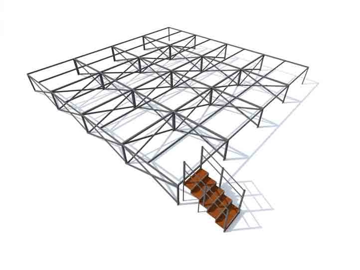 Το κάθε πλαίσιο αποτελείται από πέντε κοιλοδοκούς 30 Χ 60 Χ 3mmπου δημιουργούν ένα πλαίσιο 2,5 Χ 2,5 μέτρα με την πέμπτη κοιλοδοκό να χωρίζει το πλαίσιο και να αποτελεί στήριγμα για δύο πλακάζ θαλάσσης (σημύδα) διαστάσεων 250 Χ 125 Χ 2 εκατοστά με αντιλισθητική επιφάνεια (αφροκάρ) που δημιουργούν το πάτωμα της εξέδρας.