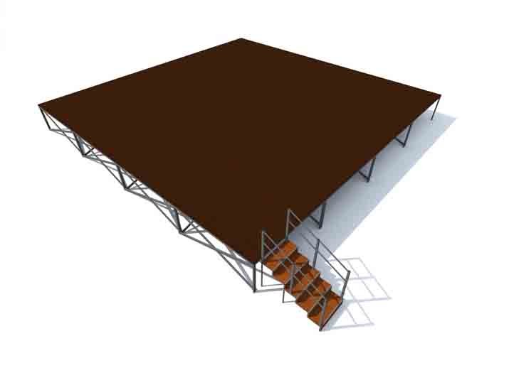 Η εξέδρα αποτελείται από δεκαέξι (16) ανεξάρτητα όμοια πλαίσια διαστάσεων 2,5 Χ 2,5 Χ 1 μέτρο ύψος και μία σκάλα ανάβασης. Τα πλαίσια όταν τοποθετούνται δίπλα δίπλα δημιουργούν μια εξέδρα 10 Χ 10 μέτρα και ύψος 1 μέτρο.